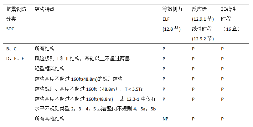 在分析結(jié)構(gòu)地震作用效應(yīng)時(shí),必須滿(mǎn)足ASCE 7 定義的分析方法、建模準(zhǔn)則及其他要求。ASCE 7 提供三種分析方法,表12.6-1 列出了對(duì)不同參數(shù)條件下的分析方法。參數(shù)條件包括抗震設(shè)計(jì)類(lèi)別SDC、風(fēng)險(xiǎn)級(jí)別、施工類(lèi)型、高度、不規(guī)則性。三個(gè)分析方法是(1)等效橫向荷載ELF方法 -- ASCE 7 $12.8;(2)振型反應(yīng)譜(MRSA)方法 -- ASCE 7 $12.9;(3)地震反應(yīng)時(shí)程方法 -- ASCE 7 第16章,包含線(xiàn)性和非線(xiàn)性方法。BRBF結(jié)構(gòu)一般使用ELF方法和MRSA方法。